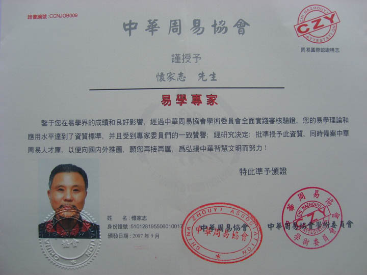 怀家志、男、1955年出生,安徽省亳州市人。知青,退伍军人,警察,道士。毕业;北京中医药大学、中药学专业。新加坡中药学院、中药学专业。新加坡温莎管理学院、建筑工程管理专业。现专职研究国学,传统文化。国际注册易学专家;国际注册高级地理环境堪舆师(ICSGEG)。注册国际心理咨询师(CIPC)。国际注册健康管理师(ICSHM)。国际注册高级风水师;国际注册高级命理师;国际注册高级命名师。中囯注册国学传承师。中国注册国学讲师。中国注册职业中医医师。中国注册职业中药药师。中国注册高级建筑人文环境规划师。中国注册营养师;中国注册健康管理师。中华周易协会学术委员会副主任。深圳市嘉俊源文化艺术传媒有限公司;总策化;执行主席。国际周易研究学院;院长。中华易命理风水研究中心;能量經絡治療中心;总顾问:怀家志。为東方的易学、中医、中药、养生、經絡、能量、推动世界文化祖源出发、[東方的《易经》、西方的《圣经》、印度的《吠陀经》、阿拉伯的《古兰经》],中华周易协会学術委员会。国际周易学術认证。颁发(中华周易协会资格证书)并授权本人使用(周易国际认证標志)。中华周易资質认证书。(高级预测师)。中华周易资質认证书。(高级风水师)。中华周易资質认证书。(高级命名师)。载入:中华周易协会优秀人才库。(中华周易名人)錄、中国四川省著名的易学专家/命名学专家,擅长多项周易预测方法,多年苦心研修成为易学专家。2001年被栽入(世界名人)錄。2005载入(神州强国人才大辞典)錄。经国际华夏周易协会。首届国际华夏易学大会评审委员会授予:2006年度世界华人易学界百名易学成就奖。经2007中华易学文化大会专家学术委员会严格评审授予2006中华易学精英。2007年载入(中华易学文化通鉴辞典)易学名家錄。